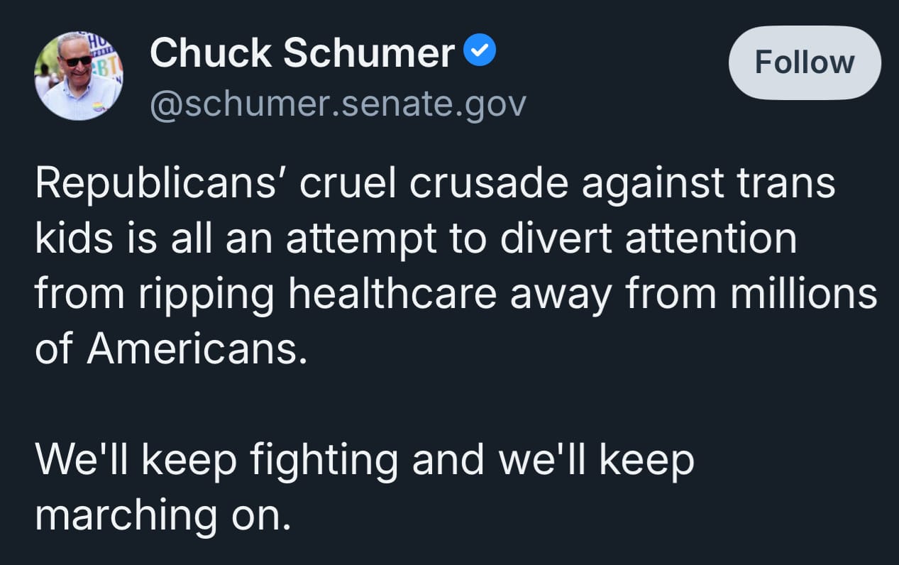 "Republican's cruel crusade against trans kids is all an attempt to divert attention from ripping healthcare away from millions of Americans," Sen. Chuck Schumer posted (and, after the resulting outrage, deleted) on Wednesday.