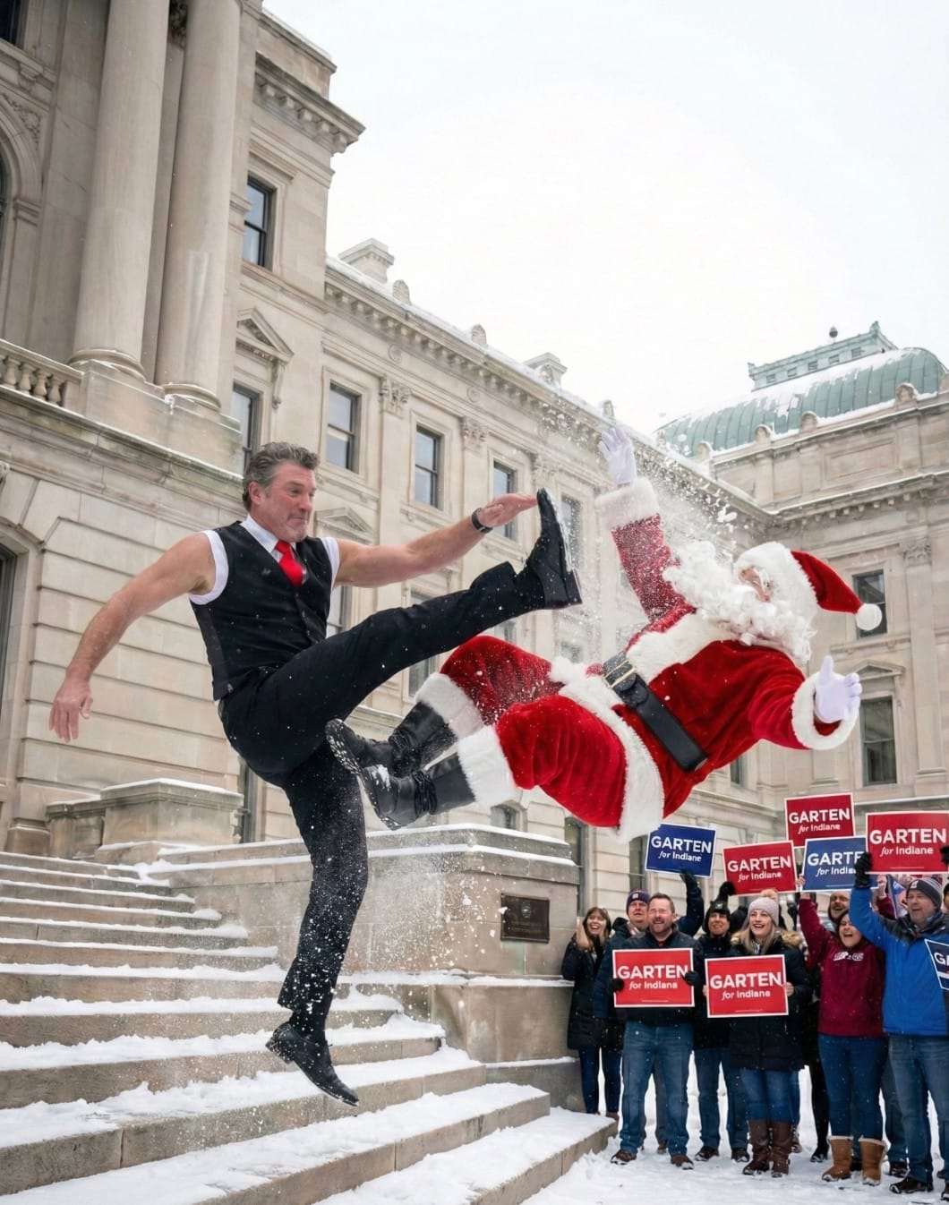 But I'm afraid I just don't understand Christmas anymore, which is odd because it was supposed to be saved, a whole lot of people insisted that they saved it, in fact, so we should be seeing the maximal, fully patched and presentable version of Christmas this year. Instead, every present is more expensive. And all the food is more expensive. And Indiana Senate Majority Floor Leader & President of Signature Countertops Chris Garten is posting AI-generated pictures of himself kicking Santa Claus down a flight of steps and beating the holy holiday shit out of him.