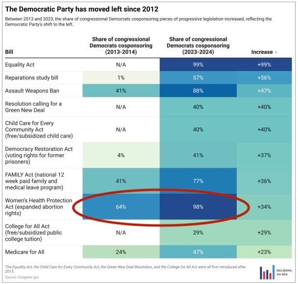 Republicans also moved toward the center on several issues, including moderating their stances on Medicare and Social Security and dropping pledges to repeal the Affordable Care Act, ban abortion nationwide, and pass a constitutional amendment to prohibit same-sex marriage.
