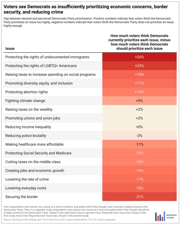 These results tell a clear story. Voters see Democrats as insufficiently prioritizing issues like the cost of living, the economy, immigration, health care, taxes, and crime, which are all top concerns for voters. At the same time, voters see Democrats as putting too high a priority on climate change, democracy, abortion, and identity and cultural issues.
