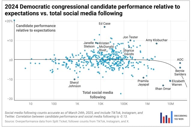 There's a whole section dismissing base mobilization as a strategy, instead emphasizing the need to appeal to swing voters. But Dem-leaning irregular voters were the ones staying home in 2024, which doesn't square. The report at one point lists "Unpopular Democratic policies" like "Abolish the police," "Abolish prisons," and "Provide free health care to undocumented immigrants," none of which are within a mile of being actual Democratic "policies" but which instead were cribbed from far-right monologues. Left-leaning critiques of Democratic campaigning are shoved off into their own section, derided as "The New Politics of Evasion," where the discrepancy between Republican and Democratic media reach is brushed off with assertions like "legacy media is less powerful than ever."