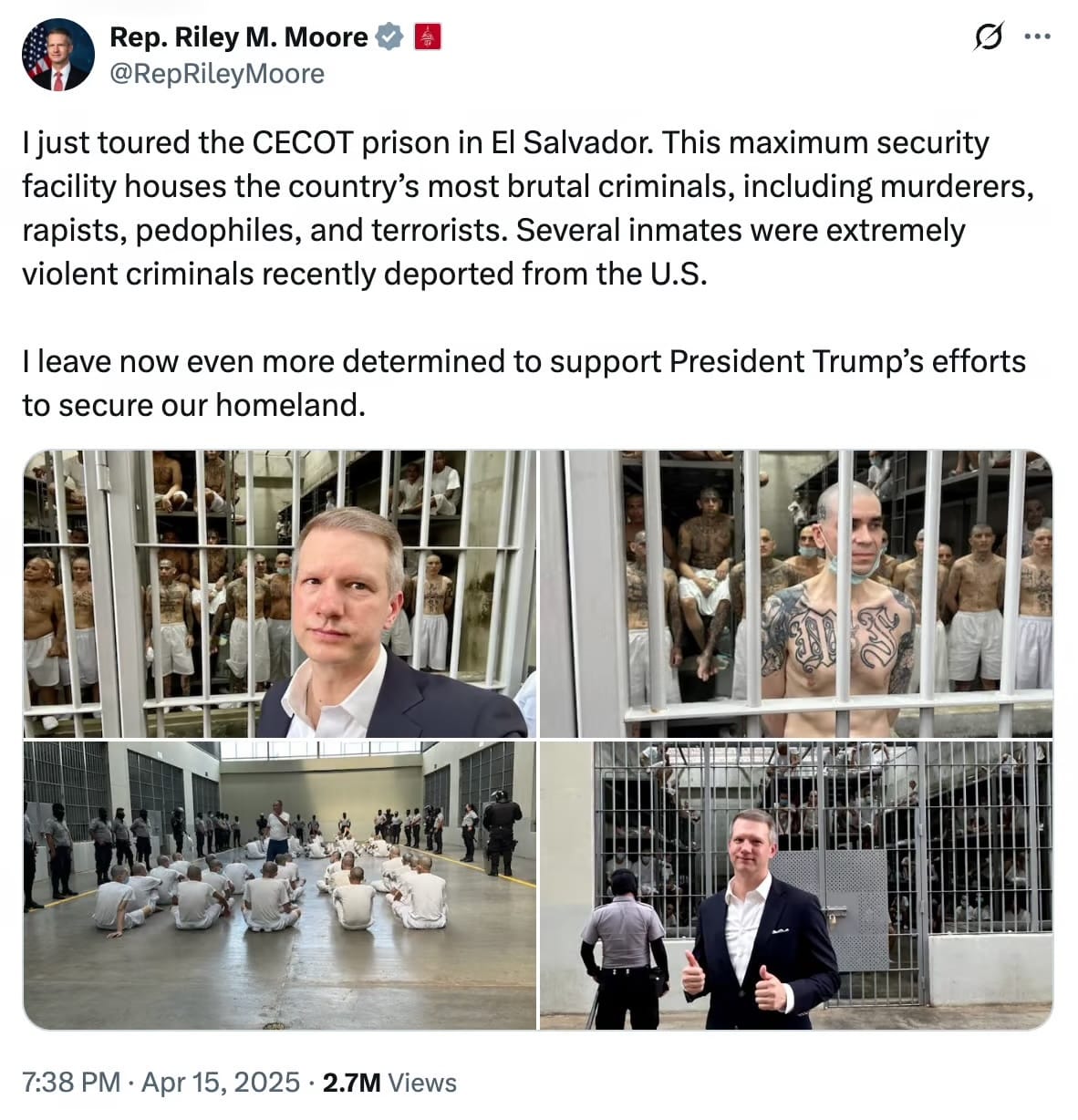 Republican representatives even travelled to El Salvador on the taxpayers' dime and conducted their photo ops at the prison after being given tours and demonstrations of the harsh conditions. Democratic reps had to pay their own way and were refused admission.