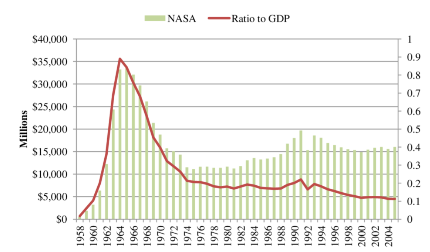 NASA is often accused of being a "jobs program." If it is, it's a very good one. Many of these facilities bring well-paying, high-tech jobs into areas where comparable employment is nonexistent. Even so, it's not a patch on where NASA was during that run up to Apollo 11.
