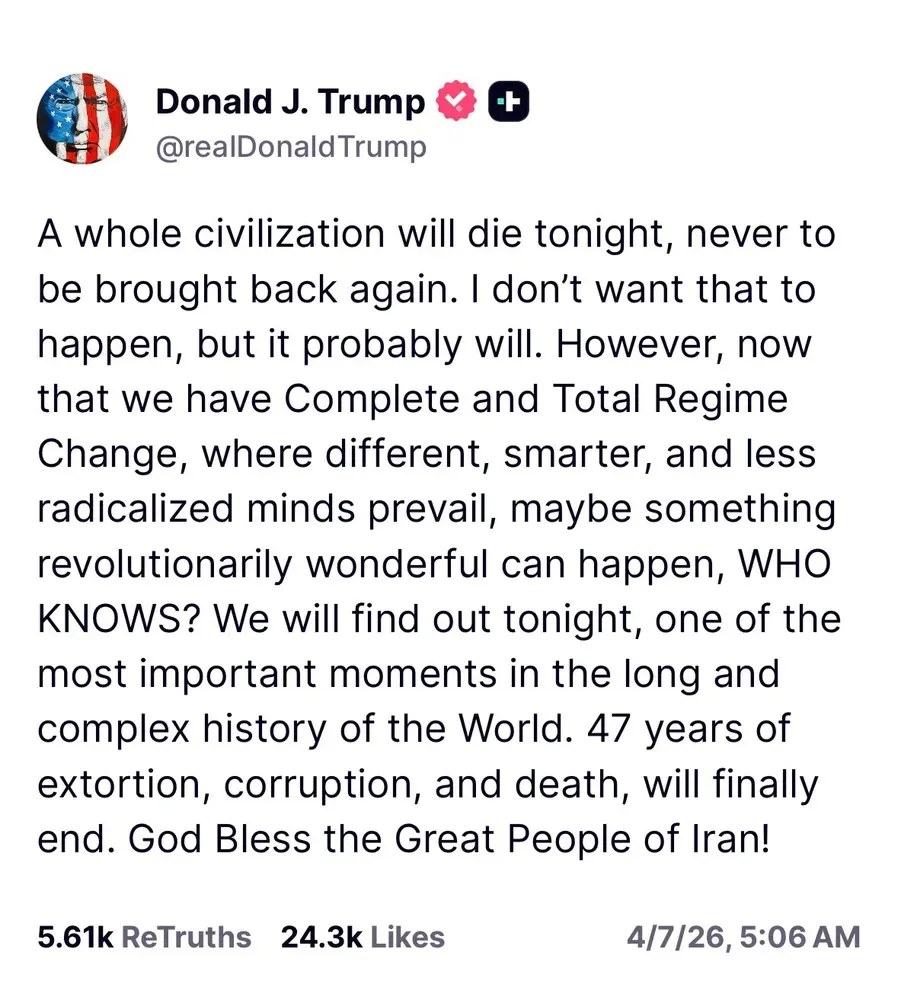 That was the seditionist Donald Trump's message to the world this morning, and it is by itself sufficient cause to remove him. It does not matter whether the man follows through with his threatened genocide or not. There is no possible argument that he is not threatening that genocide, not when "A whole civilization will die" is the final threat capping days of promises to destroy all civilian power plants, plunging Iran into famine and disease for the sake of one puffy rapist's personal whim.