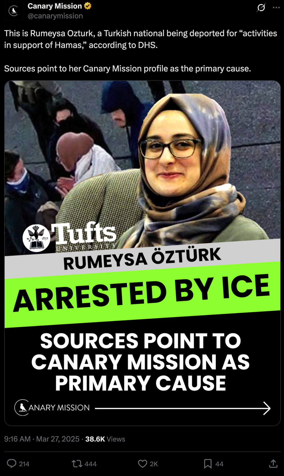 Canary Mission has bragged that it was this profile, mixing a single sentence about Rusmeysa co-authoring an editorial with paragraphs on activities by Hamas, that was responsible for her being accosted and abducted on her way to a quiet dinner with friends.