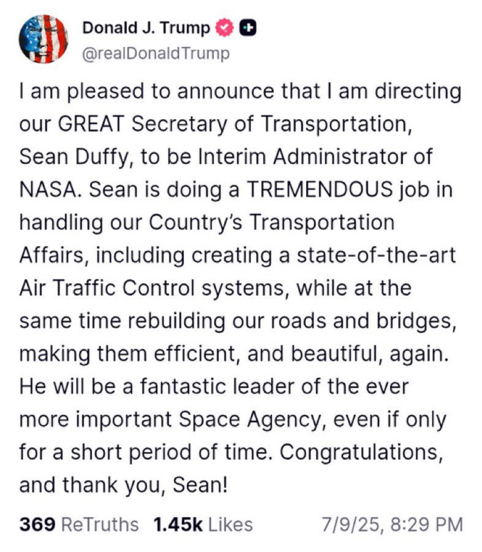 Sean Duffy has never taken even the slightest interest in science. He didn't study science, didn't introduce any legislation related to science during his time in Congress, and has absolutely nothing in his background that suggests he could run NASA—except for the dismal job he's done at Transportation. If running the space agency into the ground is the goal, he's the man for the job.