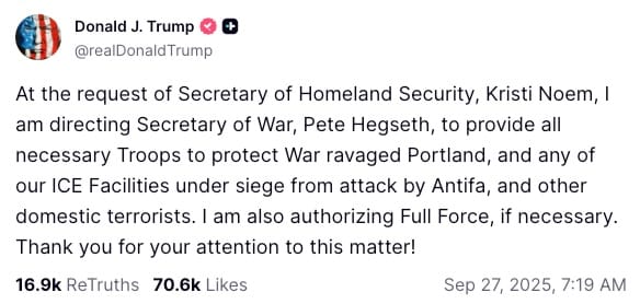 At the request of the Secretary of Homeland Security, Kristi Noem, I am directing Secretary of War, Pete Hegseth, to provide all necessary Troops to protect War ravaged Portland, and any of our ICE Facilities under siege from attack by Antifa, and other domestic terrorists. I am also authorizing Full Force, if necessary. Thank you for your attention to this matter!