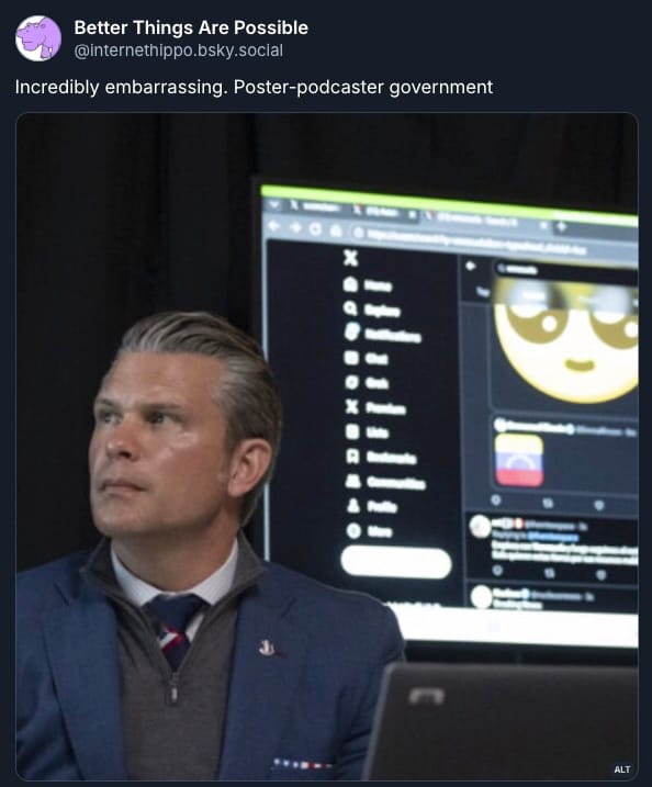 So yes, the theory that Maduro was sold out by underlings in exchange for a new understanding with the Trump administration, one in which Venezuela's government-backed crimes could continue apace in exchange for contracts assuring U.S. control of their oil fields—that's a compelling explanation for why Trump, Rubio, and Secretary Drinks-a-lot might presume that they can overthrow and "run" a foreign nation without setting down a single military camp from which to do it.
