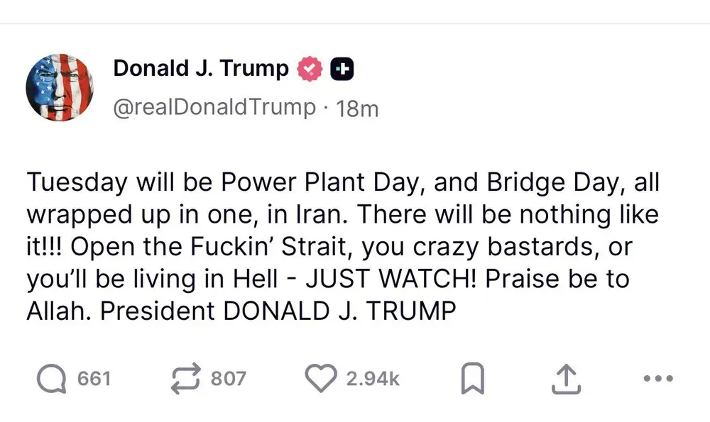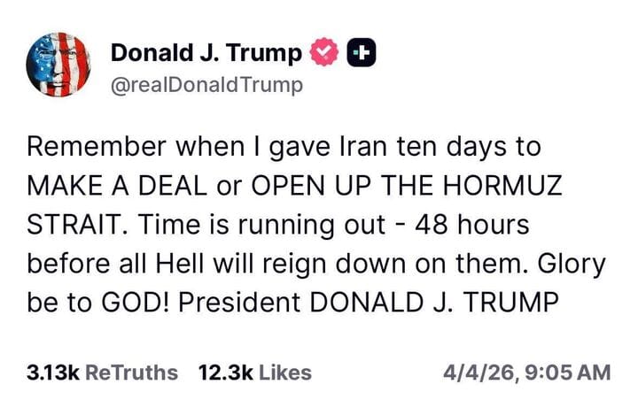 Those were among the more provocative of Trump's weekend posts, while he was out of the public eye, and it is not often that a sitting president announces that "Hell will reign," or issue a diplomatic statement demanding his enemy "Open the Fuckin' Strait, you crazy bastards," or pipe up with a "Praise be to Allah" right after saying so, and this is because most sitting presidents are not enraged decompensating dementia-addled narcissists whose brains have devolved back to toddler status.