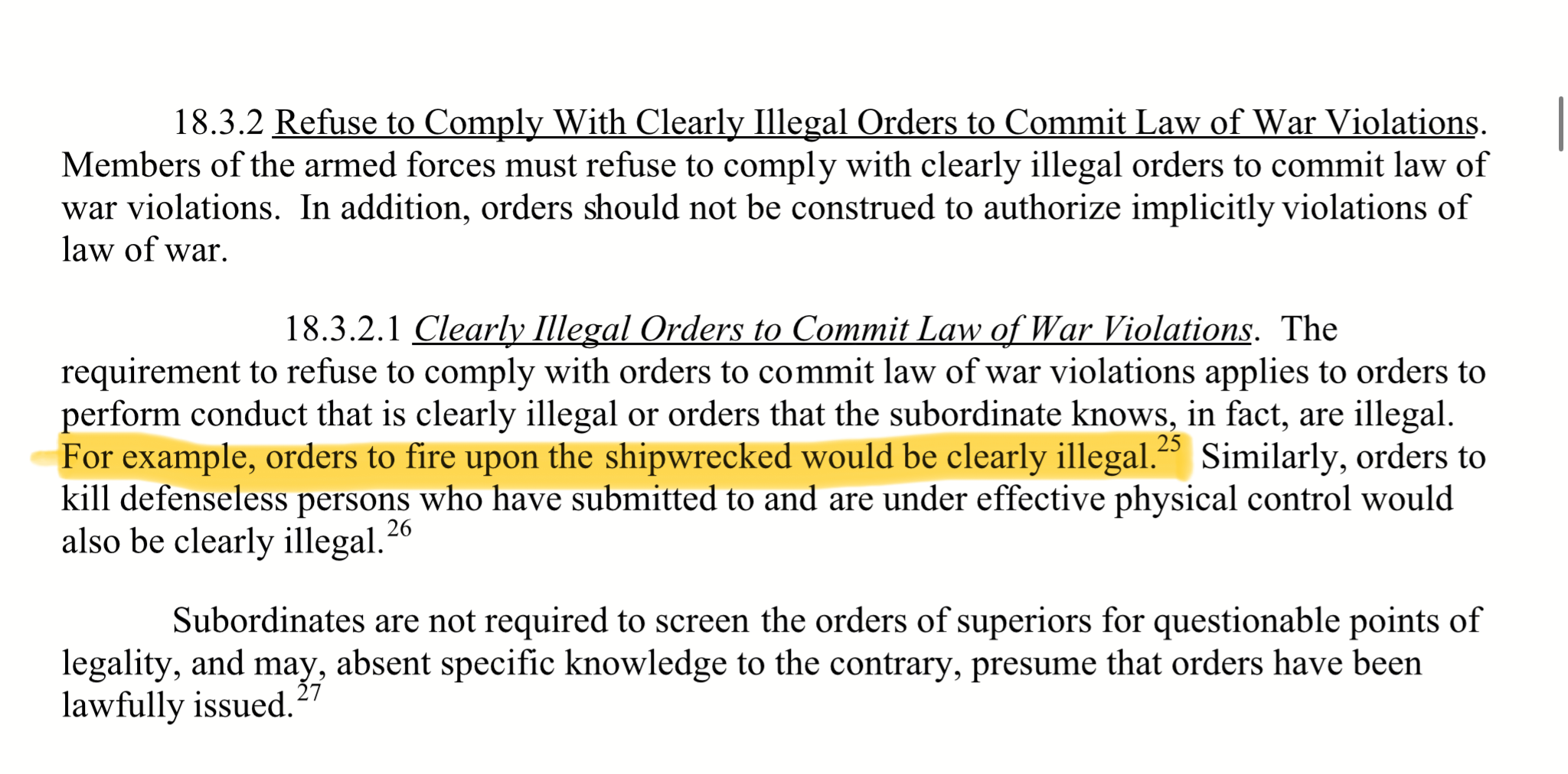 There is no circumstance under which this order is legal, and no world where it is remotely moral. Confronted about this report, Hegseth sneered at the idea of anything short of murder everyone.